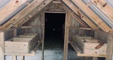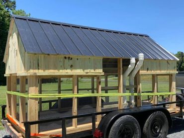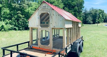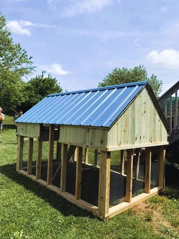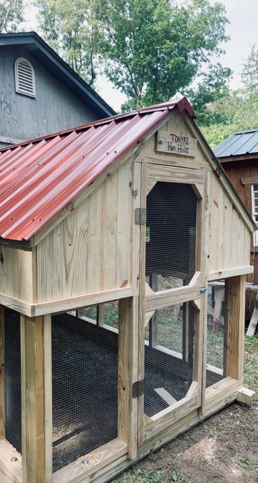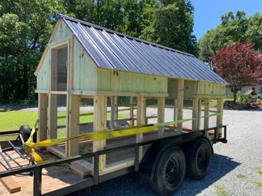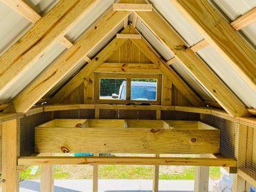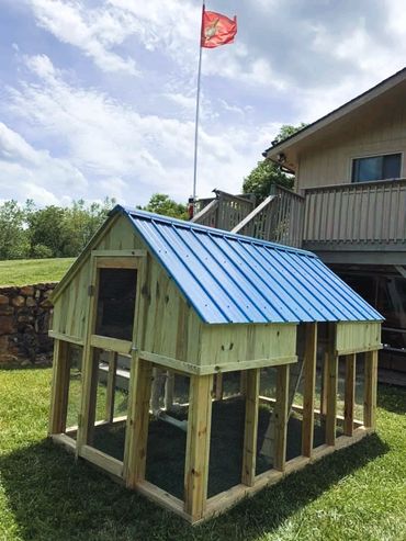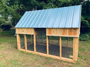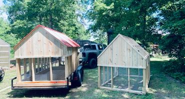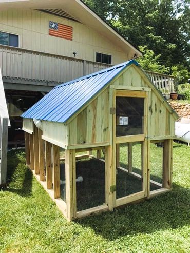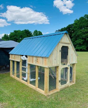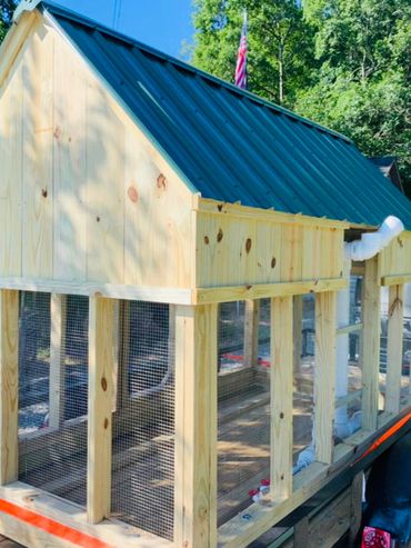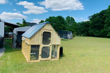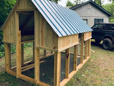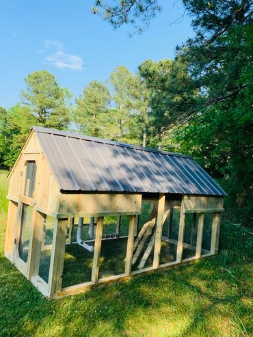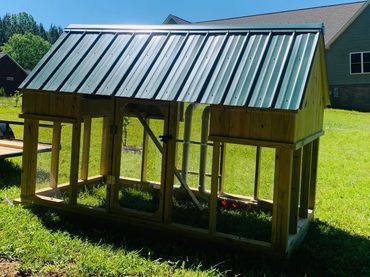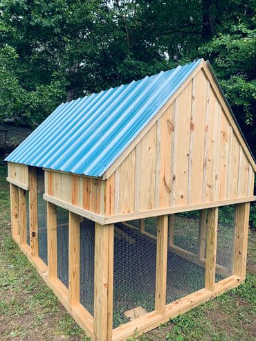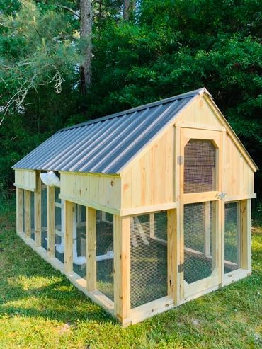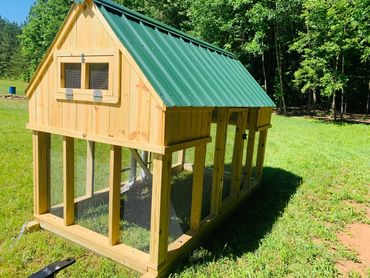 All of our coops are constructed using Ground Contact Pressure Treated Lumber, as well as 1/2” Hardware cloth, and 25 year metal roofing!